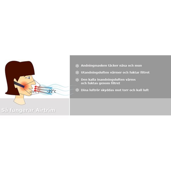 Airtrim er en fugt-/varmeveksler, der udnytter fugten og varmen fra din udåndingsluft til at give dig varme igen ved indånding. Den er fremstillet helt i formstøbt skumplast og dækker både næse og mund, hvilket gør den ekstra behagelig og giver en højere varmegrad end konkurrenterne.