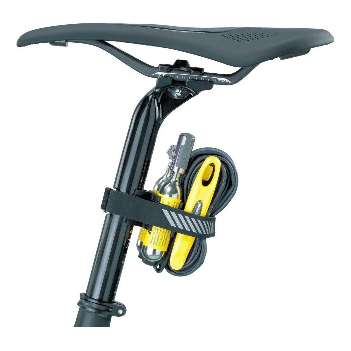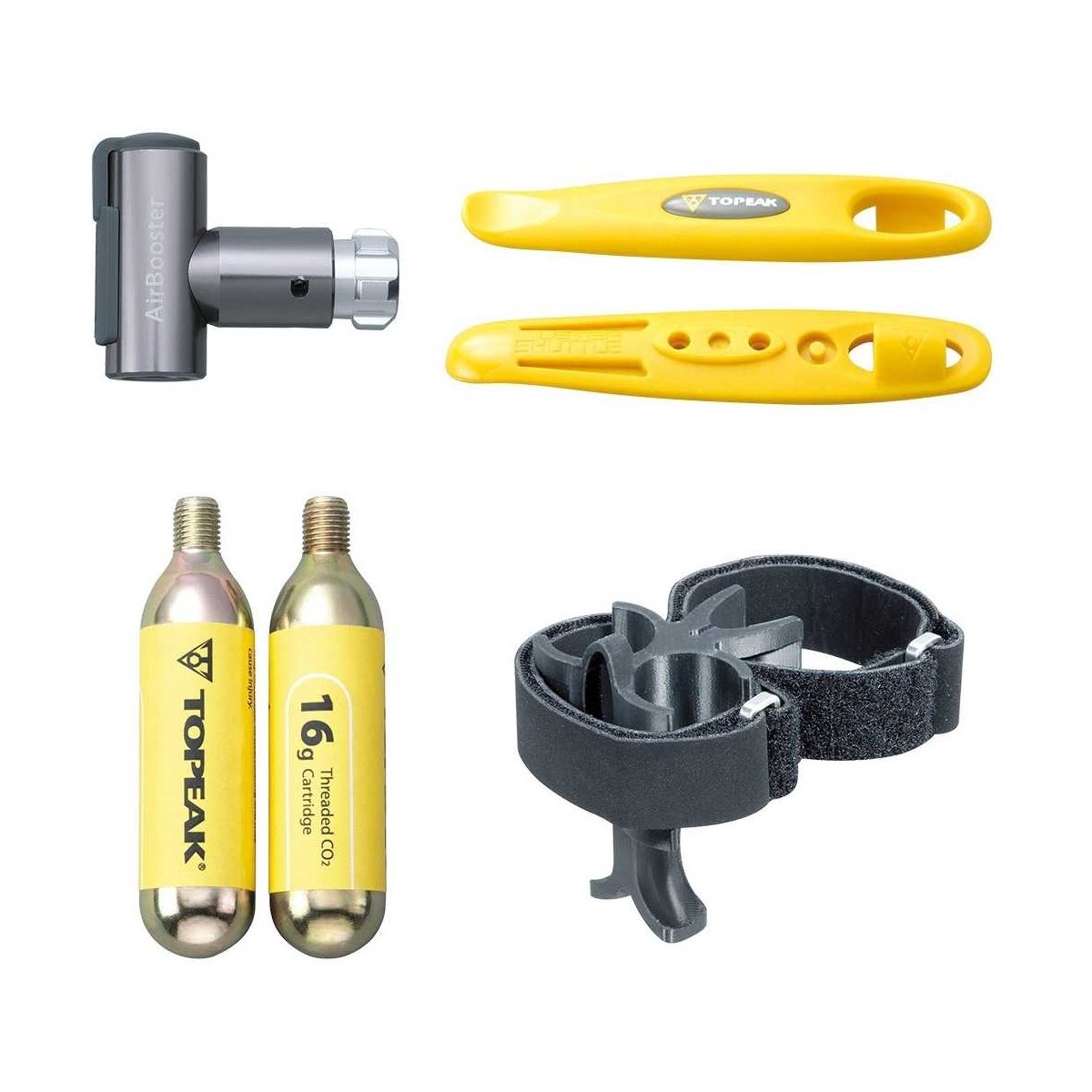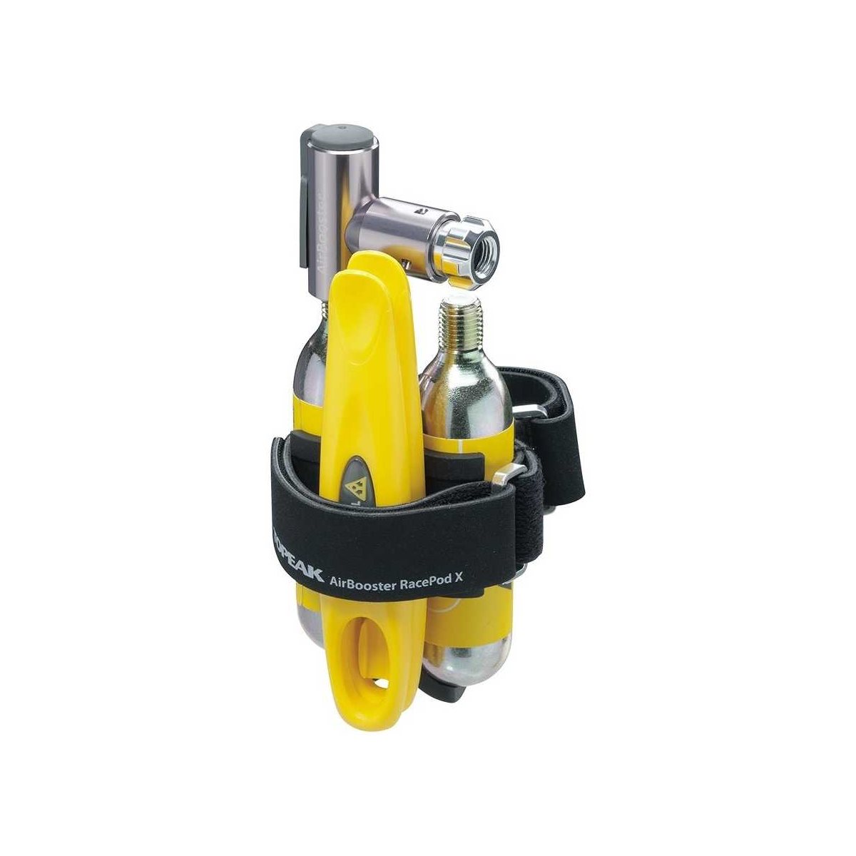 Kulsyrepatronpumpen Topeak AirBooster Race Pod X er et komplet sæt, der er både let og praktisk, og som omfatter adskillige smarte monteringsmuligheder. Inflatoren er en AirBooster CO2 fremstillet af solidt CNC-fræset aluminium med et ventilhoved, der passer til både Schrader- og Presta-ventiler. Sættet inkluderer to 16g CO2 patroner, to dækjern og en montering med velcrorem, hvilket sikrer en nem montering på stort set alle typer af sadelpinde, så du let kan overføre den mellem forskellige cykler, hvis dette ønskes.