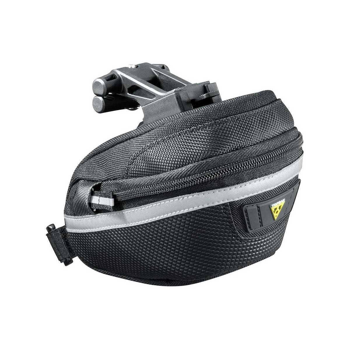Robuste og slidstærke Topeak Wedge Pack II Small er en sadeltaske fremstillet i 1000 denier nylon, som er nem at tilgå og betjene, når du skal bruge de ting, du har i den. Den er udstyret med regnovertræk, holder til baglygte og naturligvis refleksdetaljer. Tasken er QuickClick-kompatibel, hvilket betyder, at den hurtigt og let kan flyttes mellem forskellige cykler.