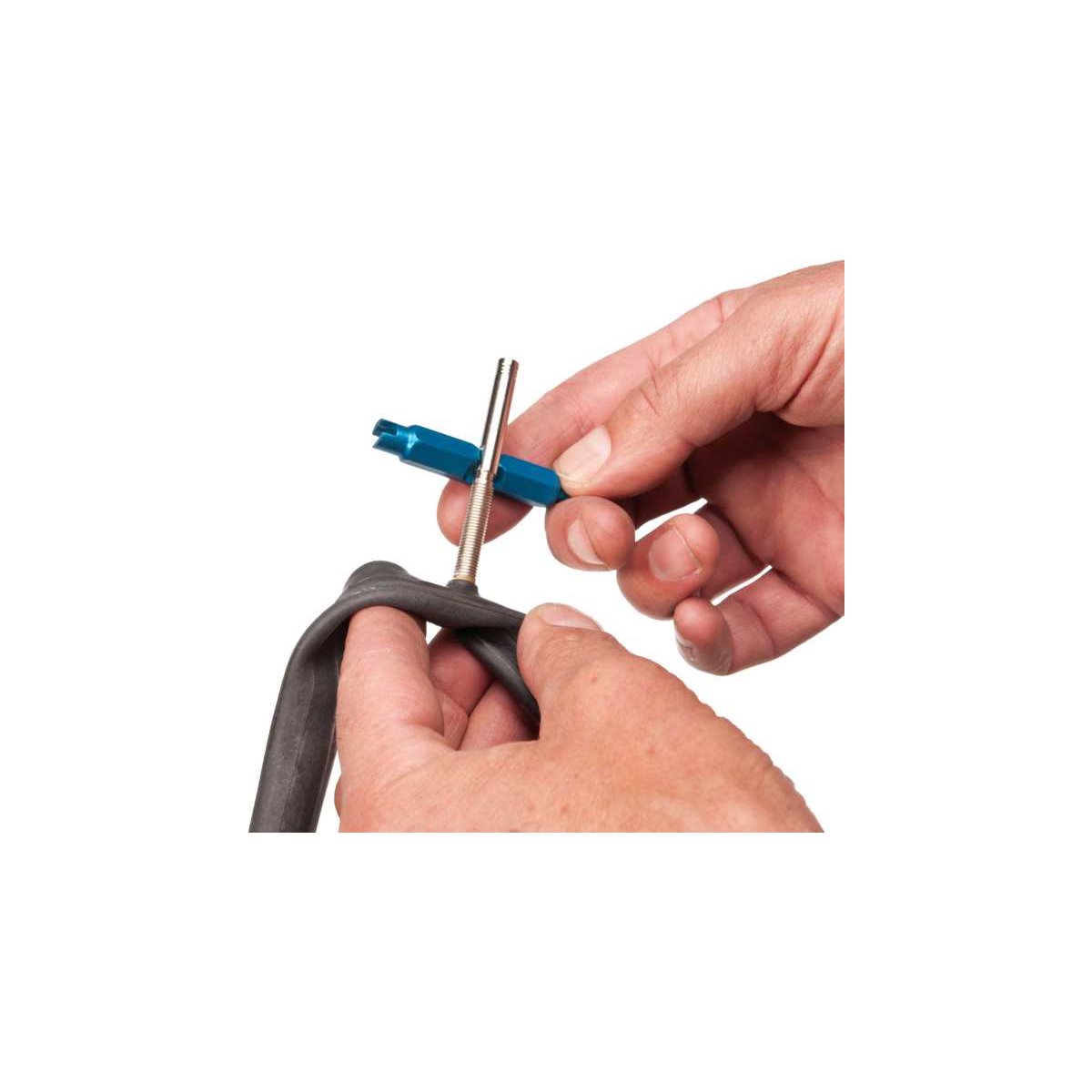 Ventilværktøj Park Tool VC-1 til af- og påmontering af ventilkernen i racer- og bilventiler. Ligeledes forsynet med en 5 mm nøgle til af- og påmontering af ventilforlængere.